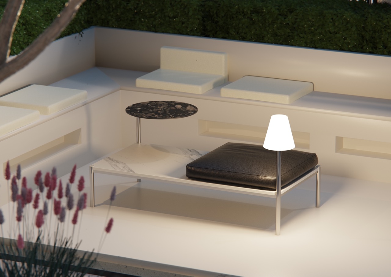 Each of the four legs can be extended with a series of accessories designed for the different scenarios of life in the garden, enriching the system with a parasol, or a small table, exploiting the concept of modules and placing very few constraints on the user.